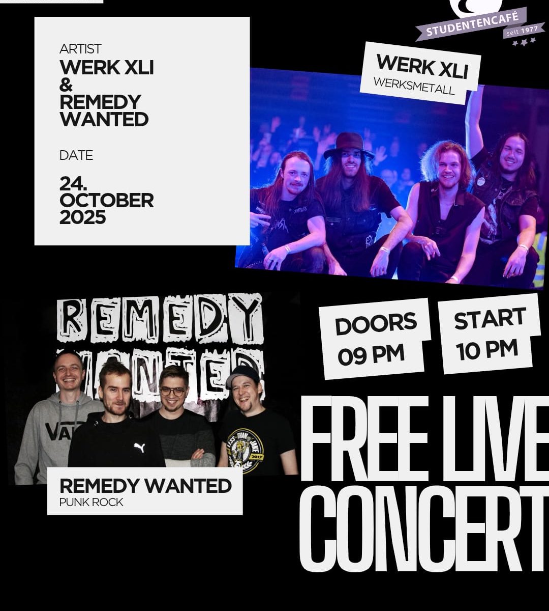 Remedy Wanted − zu Deutsch “Heilmittel gesucht”, haben sich 2016 in Weingarten gegründet. Seitdem bietet die Band Musik als Heilmittel gegen jegliche Erkrankung. Ihre erfolgreiche Therapie zeichnet sich durch melodischen Punk-Rock mit Elementen aus Alternative-Rock aus. Mit fetzigen, englisch- und neuerdings auch deutschsprachigen Kompositionen, kombiniert mit eingängigen Melodien und Mitsingparts begeistern Sie seit einigen Jahren ihre Konzertbesucher.