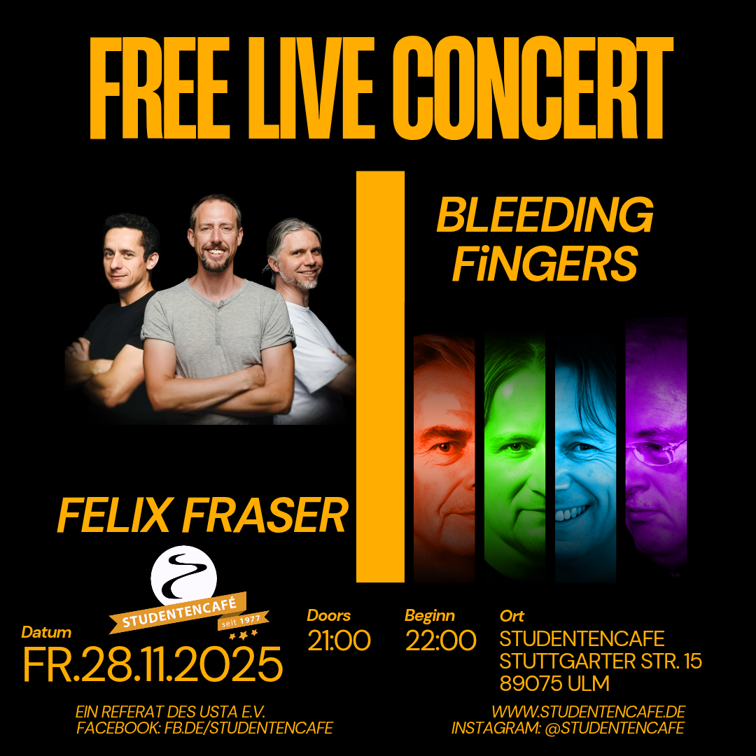 StudentencaféBock auf einen entspannten Abend mit Live-Musik? Oder sogar selber Teil der Live-Musik zu sein? Dann komm vorbei zu unserem Mittwochs Jam! Jeden Mittwoch im Studentencafé ab 21 Uhr. Eintritt frei! Genieße den Abend und die Live-Musik, oder bring gleich dein Instrument mit und sei Teil der Show. Das musikalische Konzept hinter der Veranstaltung ist …