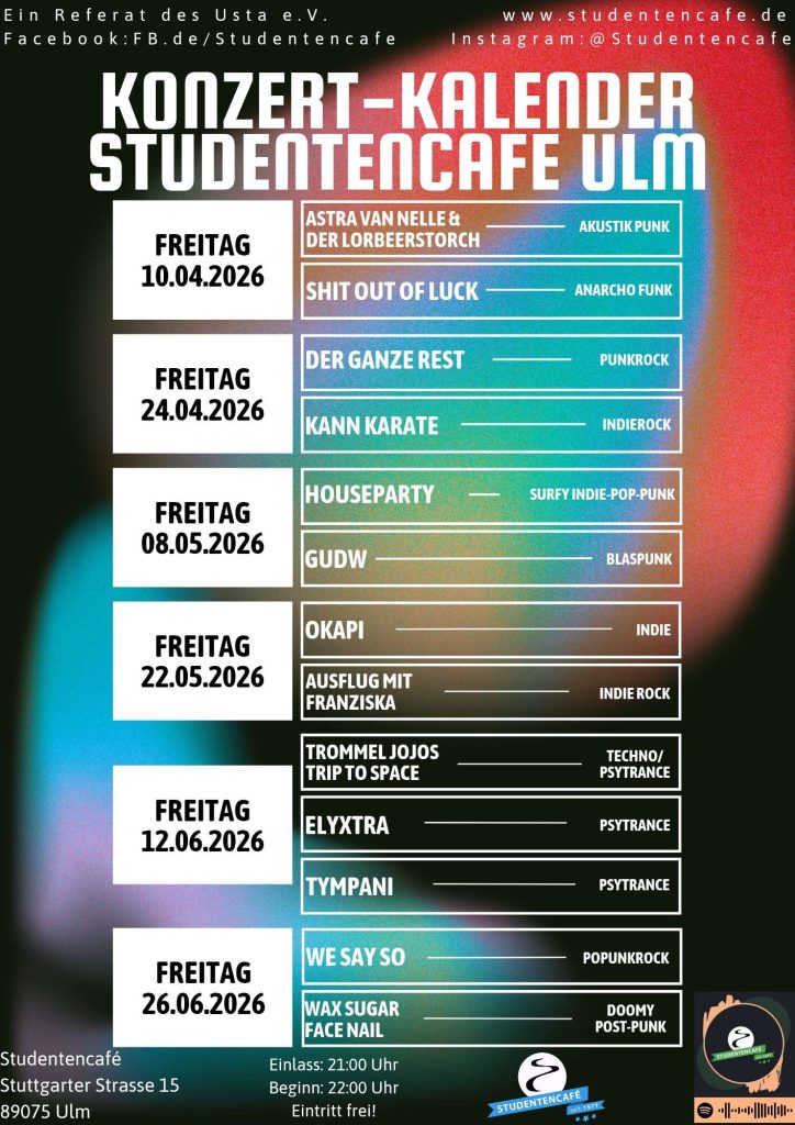 Jeden zweiten und vierten Freitag im Monat gibt es bei uns im Studentencafé kostenlose Konzerte. Eine Übersicht über die kommenden Konzerte findet ihr hier: